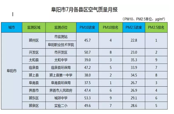 阜阳市7月份各县区环境空气质量排名来了,最差是你老家么!